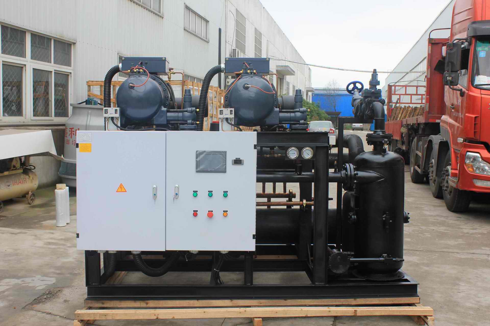 本次為黃山市大自然食品工貿(mào)有限公司設(shè)計建造的為座-30℃低溫速凍冷庫,冷庫保溫系統(tǒng)采用150MM高密度雙面彩鋼聚氨酯保溫板,制冷機組采用臺灣漢鐘半封閉螺桿制冷機組。